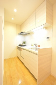 キッチン設備は3口ガスコンロにグリル、浄水器一体型水栓と食洗器も付いて機能的です。
