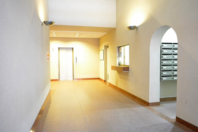 エントランスホール右側にメールBOXと管理室があり正面がエレベーターホールです。