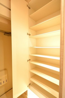 左側にはシューズBOXと収納スペースがありどちらも高さ調節可能な可動棚で背の高いものも収納できます。