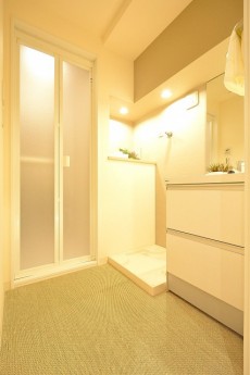 洗面台とランドリースペースが並び奥にはカウンターがありますので洗剤などを置くスペースとして重宝します。