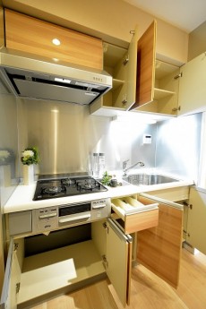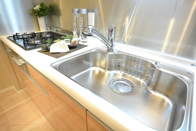 キッチン設備は3口ガスコンロ・グリルに浄水器一体型水栓も付いています。