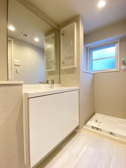 洗面室には洗面台の他に、洗濯機スペースと浴室がまとまっていて、脱衣所も兼ねています。入浴中にお洗濯が出来れば効率的ですね。洗濯機スペースの横にはカウンターがあるので、洗剤などはこちらに置くのが良さそうです。