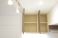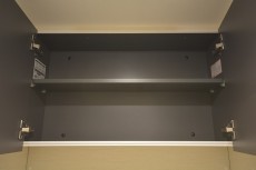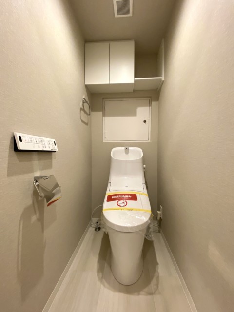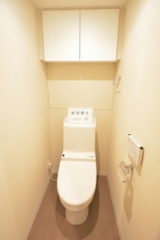 トイレは洗浄機能一体型。トイレットペーパーや掃除道具などの収納に便利な吊り戸棚も付いています。