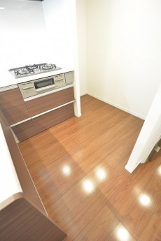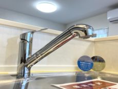 水栓は浄水機能付きシャワー水栓。切り替えひとつで水道水が美味しいお水に変わるので、気軽に使うことが出来ますよ。調理台奥には冷蔵庫スペースが確保されていました。