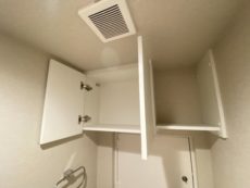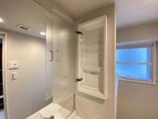 洗面室には洗面化粧台の他に洗濯機スペースと棚、浴室がまとまっていて脱衣室も兼ねています。洗面化粧台横の棚は奥行きの割に幅がないので、カゴなどの収納グッズを上手く使うのがオススメ。