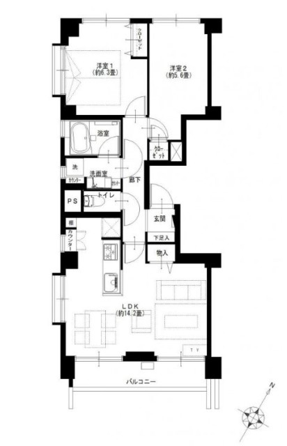 こちらは約14.2帖のリビング・ダイニング・キッチン。南東向きのバルコニーに面したワイドスパンのお部屋です。南西側にも窓があり、明るいのはもちろん風通しも良さそうですね。