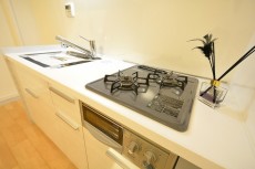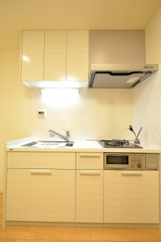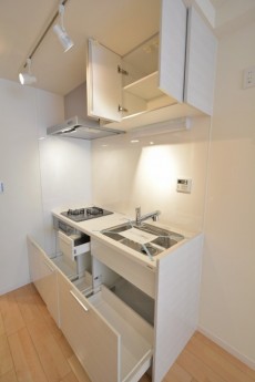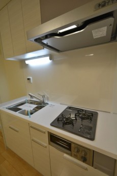 キッチンはコンパクトながら収納が多く、2口ガスコンロに浄水器一体型水栓など機能的です。