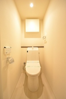 上部に収納棚と奥にカウンターがありました。観葉植物を置けば、より明るく清潔感を感じるトイレになりそうです(^^)/