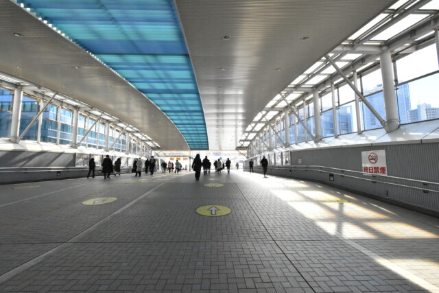 改札を出て東口へ・・・ペデストリアンデッキが近未来的ですね。ペデストリアンデッキという言葉は聞き慣れないかもしれませんが、再開発によって増えている、大きな駅ではおなじみの広い通路です。品川駅や渋谷駅のはテレビで見かけたりしますよね。