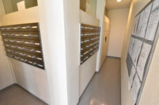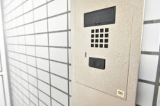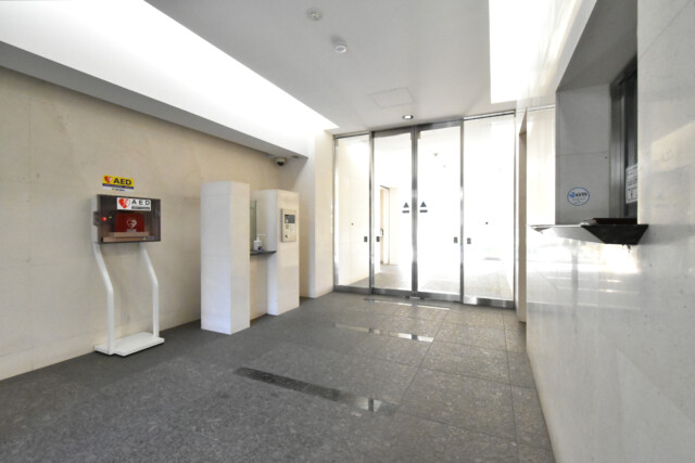 オートロックの操作盤横には「AED」。人が集まるところに置かれている印象ですが、マンションでも備えているところがあるんですね。心臓病に起因する突然死のうち約7割が自宅で発生しているというデータを見ると納得です。宅配ボックスも設置されていて留守がちな方も安心ですよ。