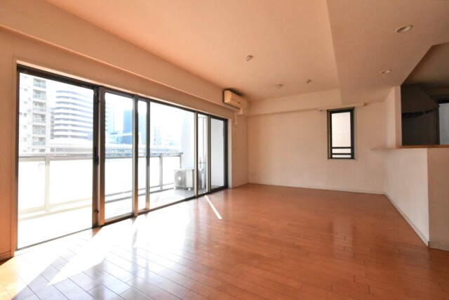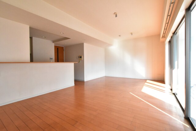 南東向きバルコニーに面したワイドスパンのお部屋です。部屋幅いっぱいの窓からの光でとても明るいですね。フローリングの温かみのある色合いによって、落ち着きのある居心地良さそうな雰囲気になっています。LDの一部(間取り図参照)には床暖房も付いているので、エアコン暖房が苦手な方も冬を快適に過ごせますよ。私もエアコン暖房モワモワして苦手なんですよね~(^-^;
