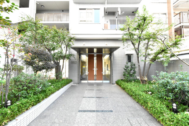 両側に植栽が植えられたエントランス。