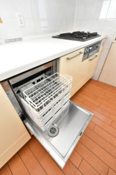 食器洗浄乾燥機付き。洗い物をお任せして、みんなで食後をのんびり過ごしましょう!洗い物による手荒れに悩む事ももうありませんよ。ちなみにこちらは未使用とのこと。なんてもったいない!と思いましたが、おひとり暮らしだったとお聞きして納得です(^^)