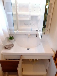 なかなか見ないタイプではありますが、良く考えるととても理にかなっていると思いませんか?棚から出して、そのまま棚に戻せるので洗面周りが散らかることがないですね!!