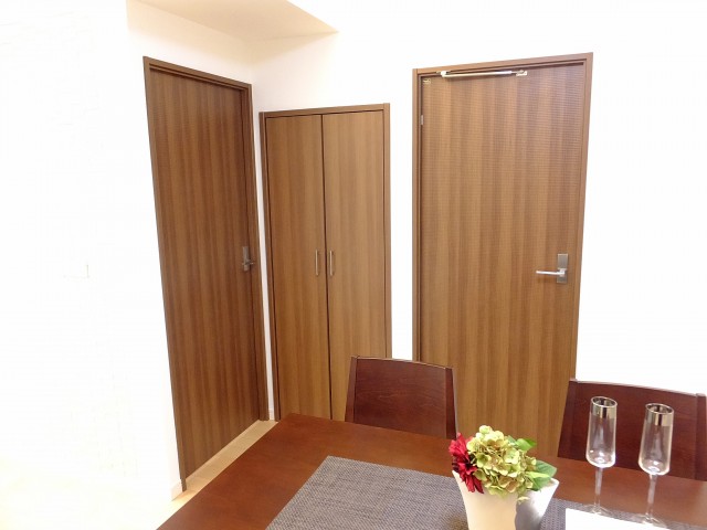 ダイニングスペースの奥に3つの扉があります。真ん中は収納棚になっています。