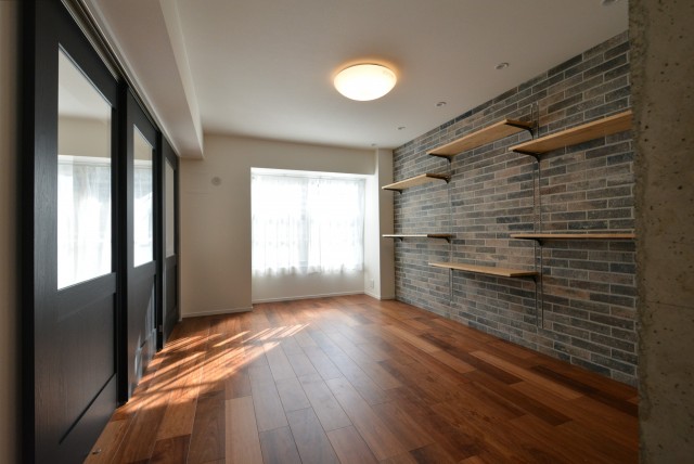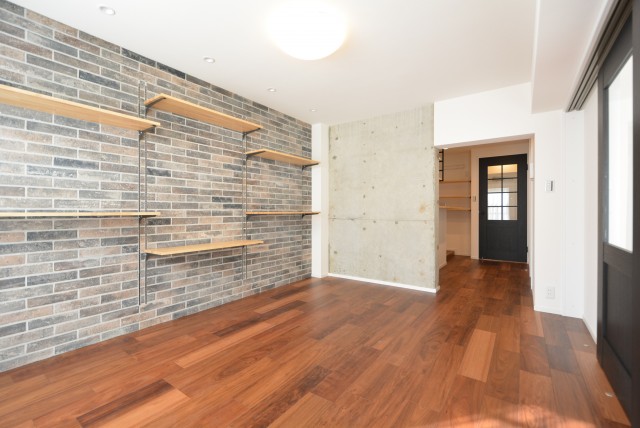 レンガ調のアクセントウォールには棚が設置されています。高さも変えられますが、棚の位置によってお部屋の印象も変わってくるので、実用的というより装飾的な面での調節になりそうです。センスの見せ所ですね(^^)