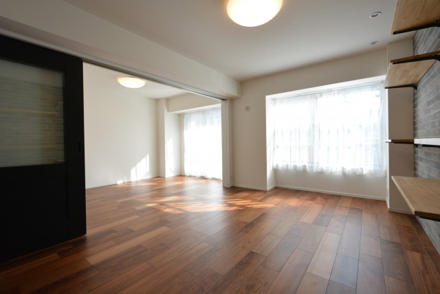 バルコニーに面した、大きな窓からの光が眩しいですね。仕切りの扉は上半分がガラスになっていて、閉めてもリビングの様子がわかる一体感のあるお部屋です。