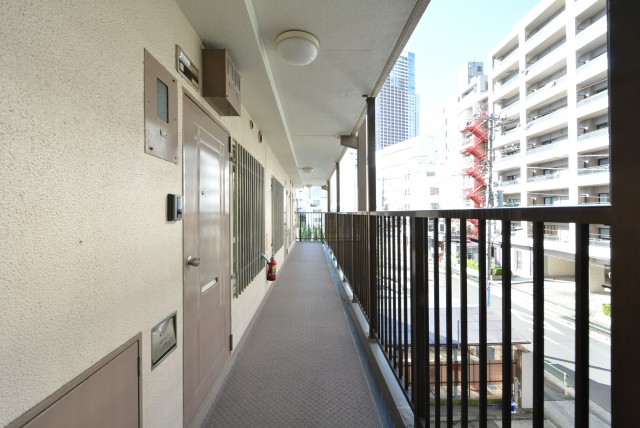 窓の外は外廊下になっていますので、しっかりと面格子が設置されています。ビルの間から遠くまで見えますね。