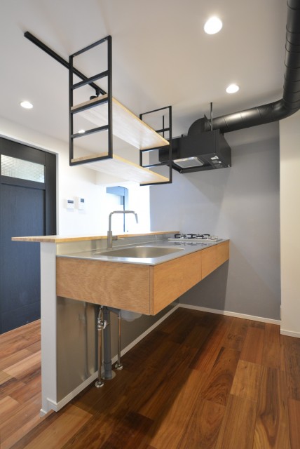 調理台には収納は少なめ。吊戸棚は扉の無いオープンな物になっています。