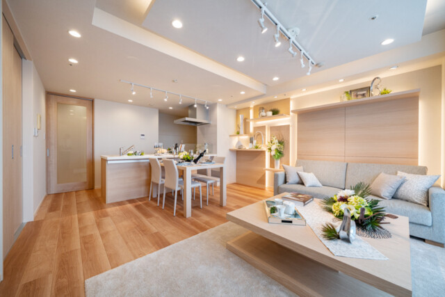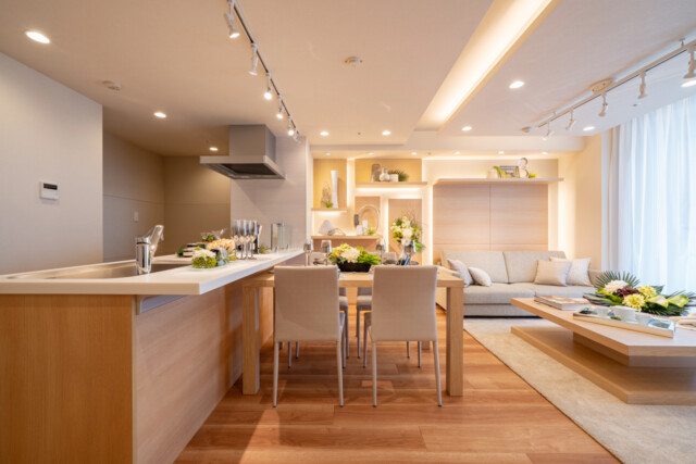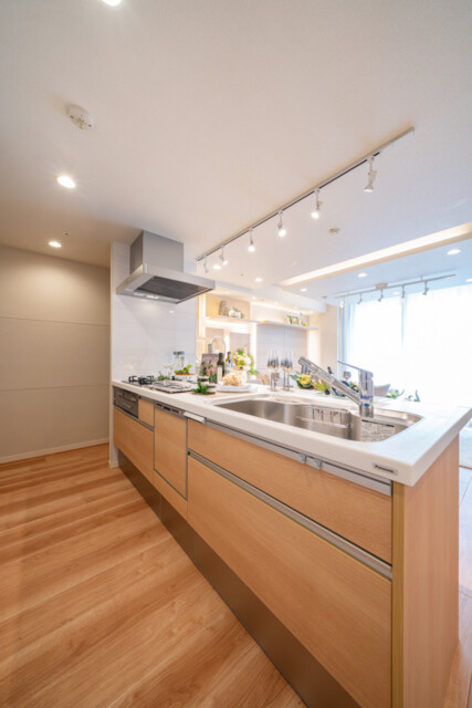 お料理中でもリビングダイニングとのコミュニケーションがとりやすいのが特徴です。トップをフラットにしたり、コンロ前のパネルもガラス製にするなど解放感にはこだわっていますね。食器洗浄乾燥機や浄水器一体型水栓など便利機能も完備!
