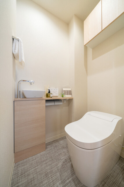 手洗いカウンターにはいろいろ飾ってインテリアを楽しめますよ。最近は芳香剤でもオシャレなものがたくさんありますからね。トイレットペーパーや掃除道具を入れるのに便利な吊戸棚も付いています。