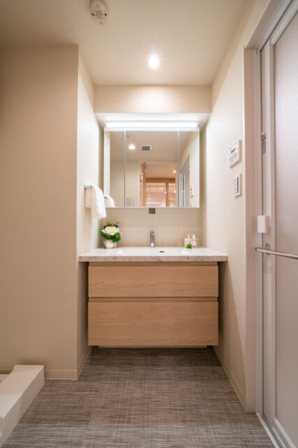 洗面室には洗面化粧台、浴室、洗濯機スペースがまとまっていて脱衣所も兼ねています。洗面化粧台は身だしなみチェックに便利な三面鏡付き。裏はキャビネットになっているので、細かい物もスッキリ収納出来ますよ。洗濯洗剤などのランドリー用品は洗濯機スペースのニッチカウンターか吊戸棚にどうぞ。