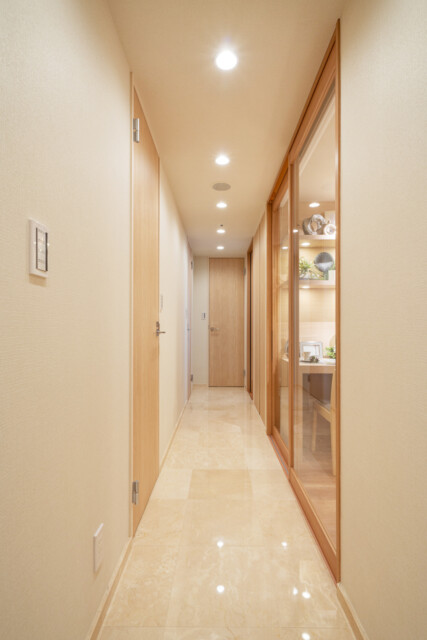 玄関・廊下は高級感のある大理石仕上げ。冷たい感じになりがちな石素材ですが、柔らかな色合いが建具の木目とよく合っていて温かみのある雰囲気になっています。玄関から廊下への段差も低く抑えられバリアフリーにも配慮されていますよ。ガラス張りのお部屋が気になりますが最後にご紹介します。