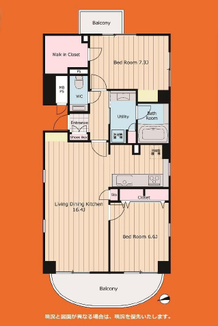 間取りのご紹介です。2LDK、約73.12㎡。バルコニーが2面にあります。