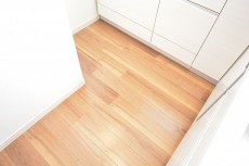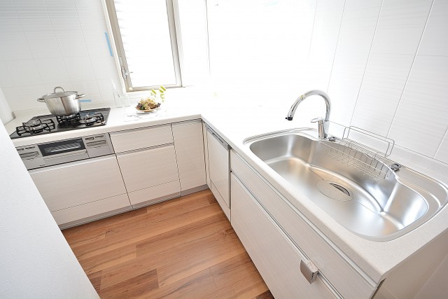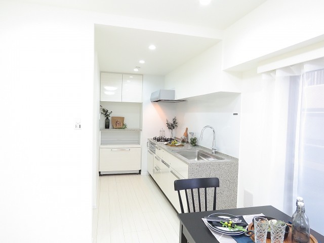 調理スペースもご覧のとおり余裕あり。システムキッチンはパッと明るい白の木目柄。ワークトップはしっとりとした質感が魅力の人造大理石が使われています。
