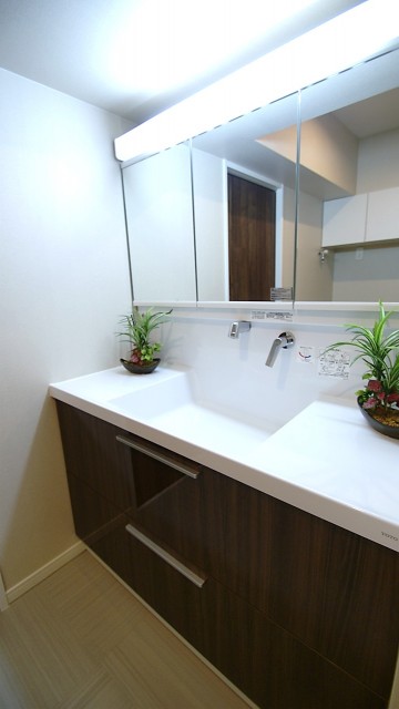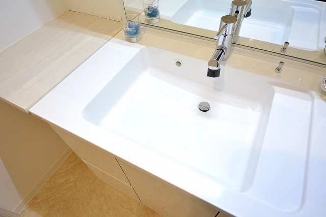 洗面化粧台は鏡の裏、引き出しと収納スペースが豊富です。