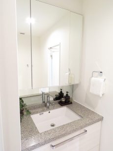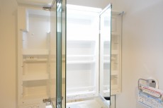 洗面化粧台の鏡の裏は一面収納になっており、ゴチャゴチャしがちな水まわりの小物もスッキリ収納いただけます。