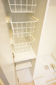 洗面化粧台のすぐ後ろ側に洗濯機置場とリネン庫。