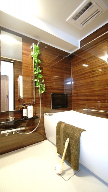 バスルームは木目調の壁が落ち着きのある空間を演出しています。