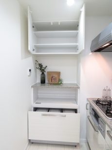 キッチン奥には電子レンジや炊飯器などの家電が設置できるところがありました。上に吊戸棚もありますね。収納豊富で◎。