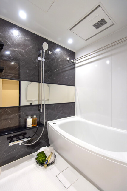 浴室はモノトーンでまとめられたスタイリッシュな印象。ストーン調で高級感もありますね。追い焚き機能付きなのでご家族でお風呂の時間がバラバラになっても安心、いつでも温かいお風呂に入ることができますよ。浴室換気乾燥機を使えばお天気を気にせず洗濯できて助かります♪