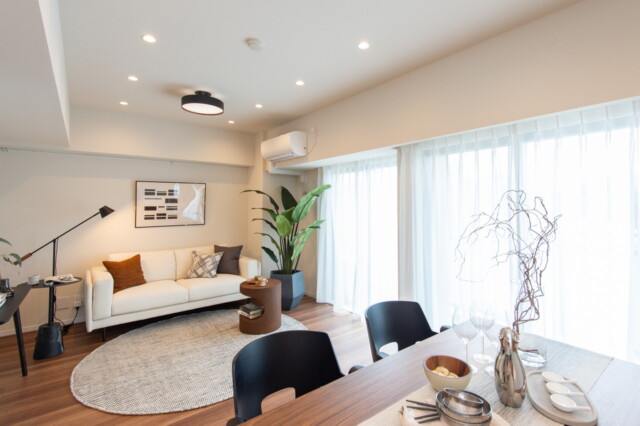 西向きバルコニーに面したワイドスパンのお部屋です。白からダークブラウンへのグラデーションでコーディネートされた室内は、ナチュラルで落ち着いた雰囲気。長い時間を過ごすのに相応しい、居心地の良さそうな空間です。