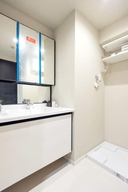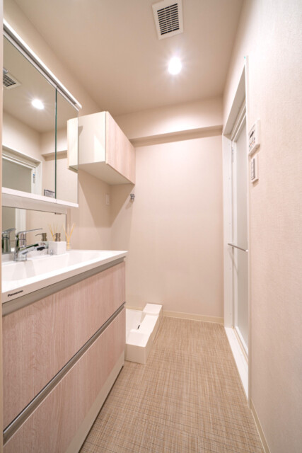 洗面室には洗面化粧台の他に洗濯機スペースと浴室がまとまっていて、脱衣所も兼ねています。洗面化粧台には身だしなみチェックに便利な三面鏡付き。裏がキャビネットになっているので、洗面周りに散らかり勝ちな細々としたものもスッキリ収納可能です。洗濯機スペースには吊戸棚が付いているので、ランドリーグッズはこちらへどうぞ。