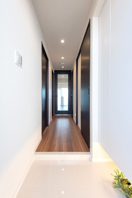 玄関から真っすぐ伸びる廊下は、突き当りのガラス戸からの光で明るく照らされています。日が暮れても人感センサーが自動的に照明を点けてくれるので、暗闇の中手探りでスイッチを探したりする必要もありませんよ。真っ白な玄関とダークな調子の廊下のコントラストがイイ感じ♪