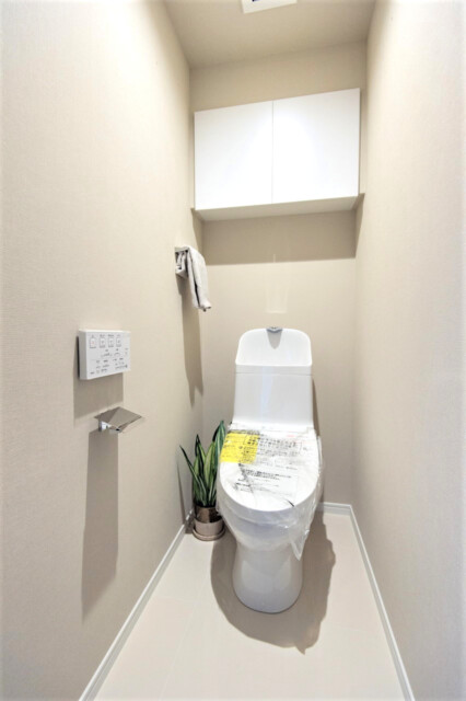 トイレはTOTO製の洗浄機能付き。トイレットペーパーや掃除道具を入れるのに便利な吊戸棚も付いています。低めに付けられているのが嬉しいですね。