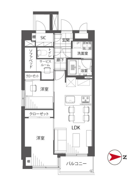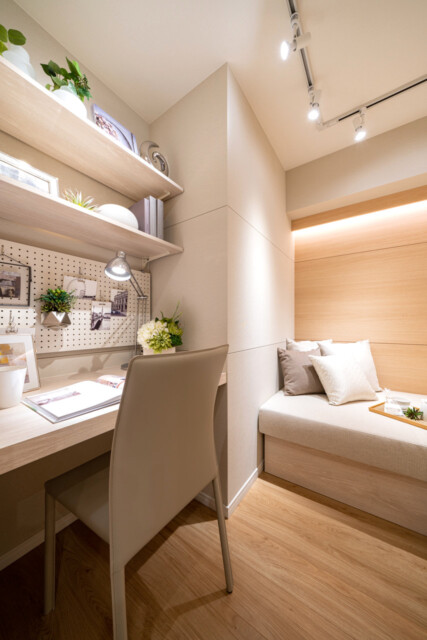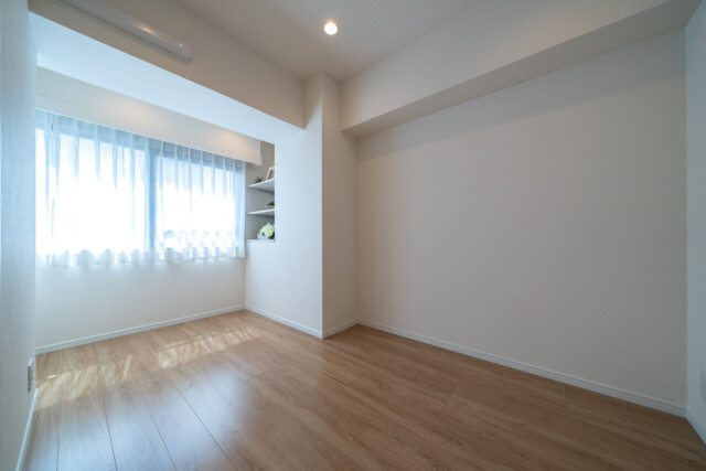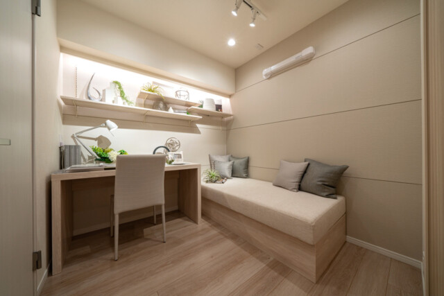デスクや棚、ソファベッドなどが備え付けられた隠れ家のようなお部屋です。書斎として在宅ワークに使うのにも良さそうですね。サービスルームというと「おまけ」みたいな感じがしますが、実は採光などの関係で法律上洋室と呼べないだけで立派にお部屋として使えるスペースなんですよ。
