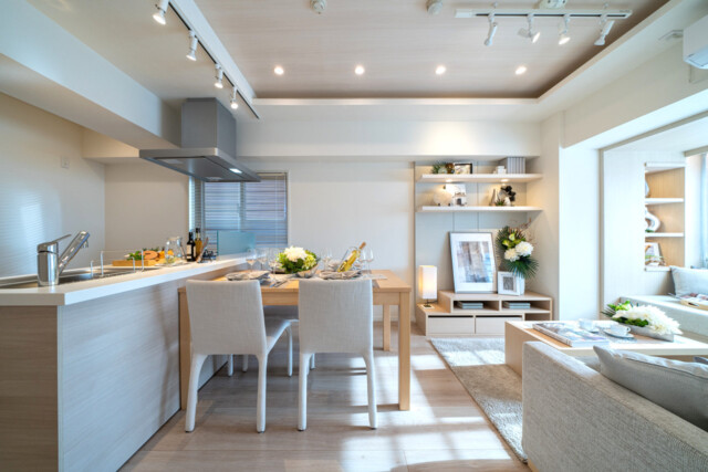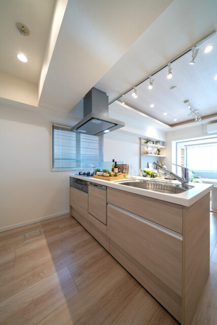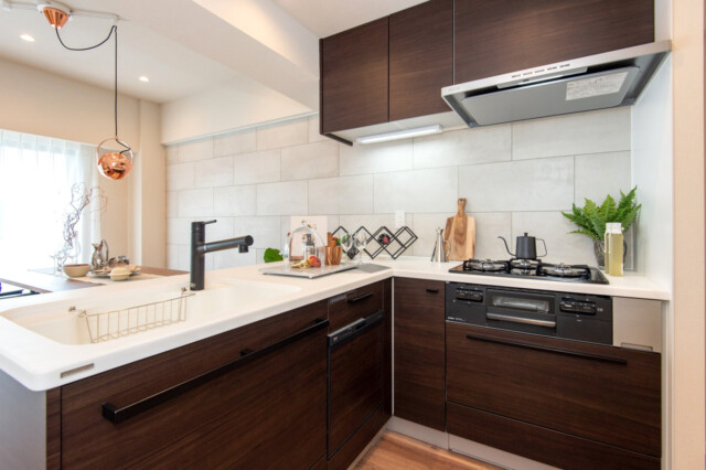 開放的で、お料理中でもリビングダイニングとの会話がスムーズなのが人気の理由です。L字型で作業スペースもたっぷり!食器洗浄乾燥機などの便利なアイテムも充実しているので、食後の時間もみんなでのんびり過ごせそうですね♬