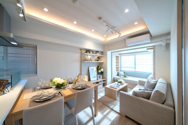 間接照明やダウンライトやスポットライトなど照明にもこだわっています。今は明るいのでわかりづらいですが、暗くなれば光の濃淡がいい感じのアクセントになりそうですね。残念ながら家具は付いて来ませんので、サイズや色、素材感などいろいろ参考にさせてもらいましょう。