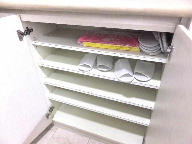 カウンター下のシューズボックスは天板が可動式なので、大きさによって、高さを変えてしっかり収納してください。