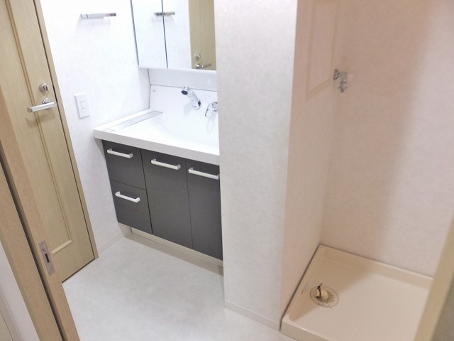 洗面台の隣りに洗濯機置場があります。その隣にバスルームと、お風呂に入る一連の流れの通りになっているのが嬉しいですね♪♪