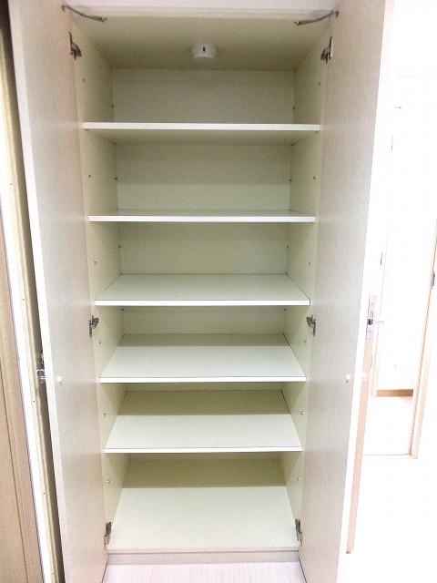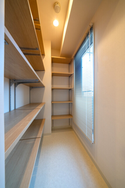 サービスルームに隣接して造られた大きな収納です。中にはハンガーポールや収納棚などが設置され、様々な状態で収められるようになっています。スーツケースや季節もの家電などのかさばる物もお任せください。