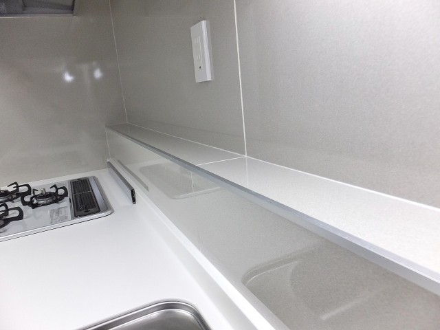 さらに!キッチンの背面には食器棚も付いています。こちらも大容量なので、普段使いのお皿から、お友達とのパーティー用の大きなお皿まで、しっかりと収納できそうですね。中段はカウンタースペースになっているので、炊飯器や電子レンジ等、大きな家電を置いておけます♪♪