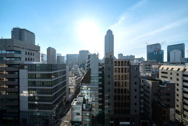 周辺には高いビルも多いのですがさすが最上階!広~い空を望めます。ロケットみたいなシルエットのNEC本社ビルが印象的ですね。