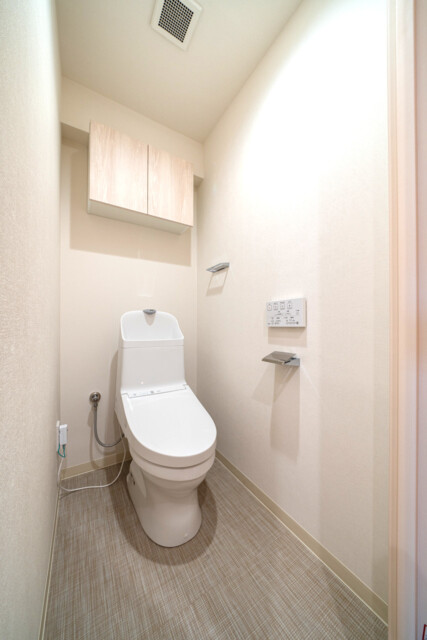 トイレはTOTO製の温水洗浄機能付き。トイレットペーパーや掃除道具を入れておくのに便利な吊戸棚も付いています。