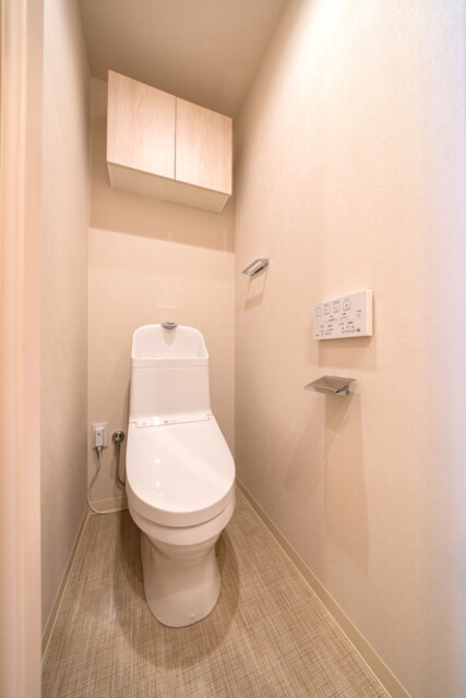 トイレはTOTO製の温水洗浄機能一体型。トイレットペーパーのストックや掃除道具を入れるのに便利な吊戸棚も付いています。