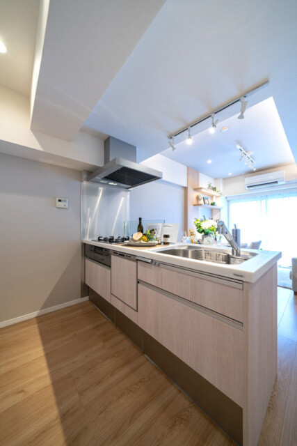 キッチンはカウンタータイプ。開放的で、お料理中でもリビングダイニングとコミュニケーションをとりやすいのが特徴です。調理台はナチュラルな木目パネルでお部屋との統一感もバッチリ。食器洗浄乾燥機や浄水器一体型水栓などの便利機能ももれなく付いています。